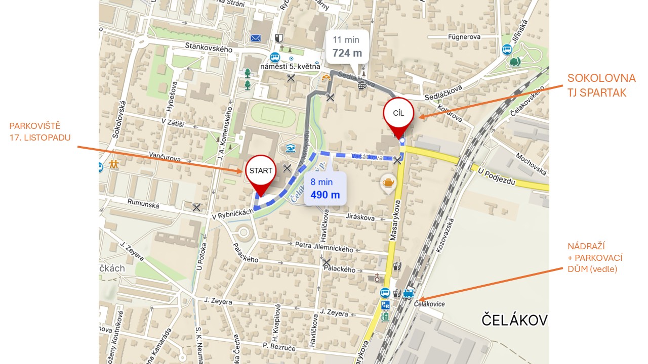 Do Čelákovic se dostanete vlakem (z Prahy, nebo ze směru Kolín / Nymburk / Lysá nad Labem). Přijedete-li autem, můžete zaparkovat v parkovacím domě u nádraží, případně na parkovišti 17. listopadu (viz přiložená mapka).