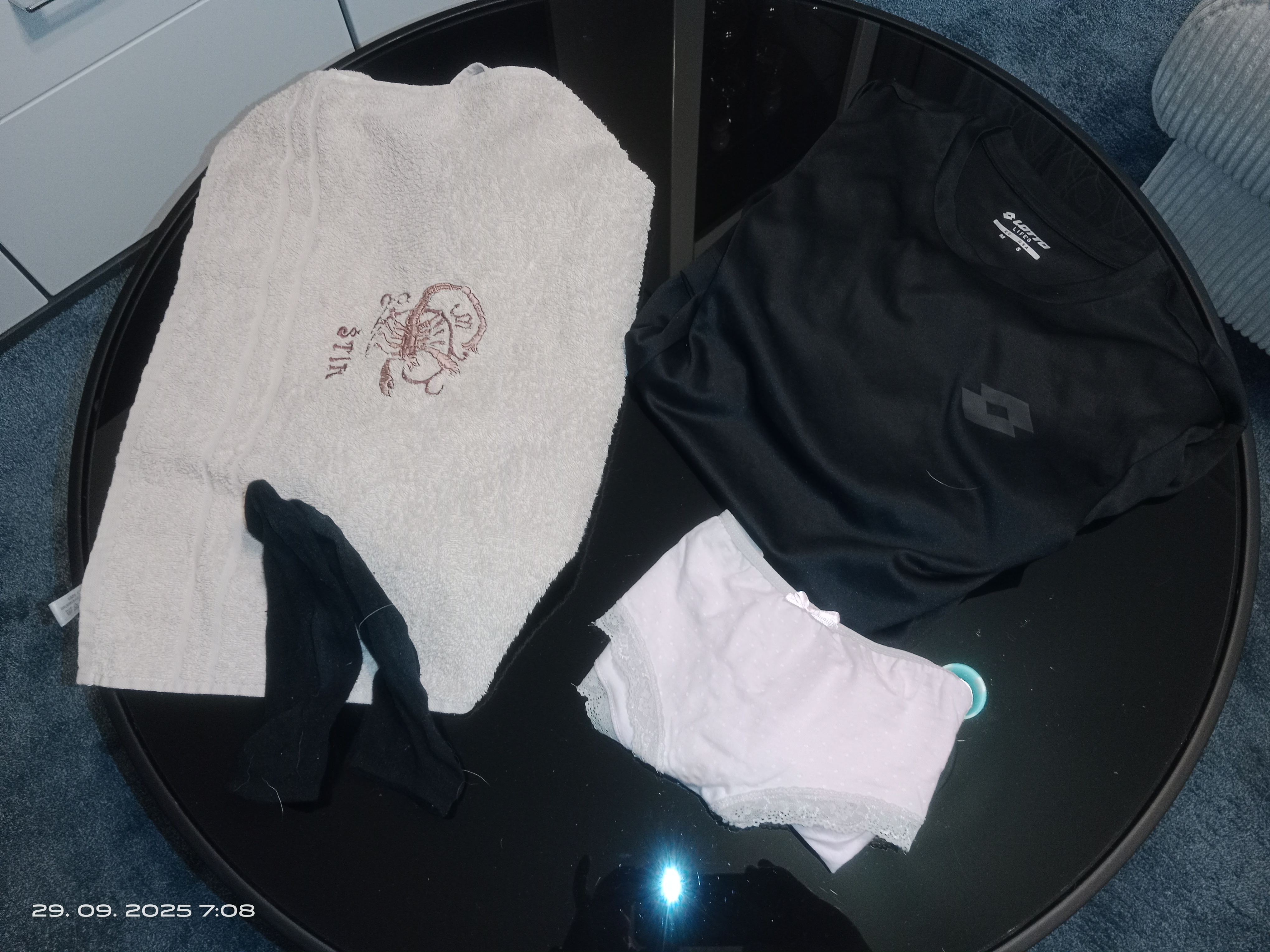 Ručník se štírem, černé triko, spodní prádlo, ponožky.